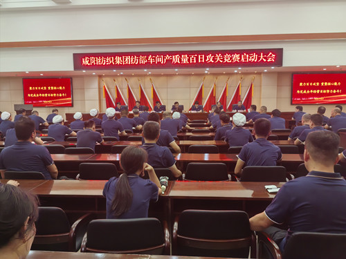 2025年8月4日下午,咸陽(yáng)紡織集團(tuán)召開紡部車間產(chǎn)質(zhì)量百日攻關(guān)競(jìng)賽啟動(dòng)大會(huì)。集團(tuán)領(lǐng)導(dǎo)班子成員,一分廠、二分廠、秦越紡織副中層及以上管理人員,集團(tuán)部室負(fù)責(zé)人,各生產(chǎn)單元紡部車間輪班長(zhǎng)、設(shè)備維修人員代表等齊聚一堂,共同吹響了紡部車間產(chǎn)質(zhì)量百日攻關(guān)的沖鋒號(hào)角。